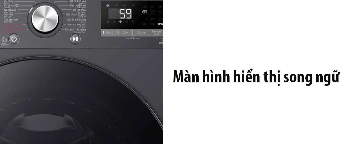 Máy giặt được trang bị bảng điều khiển song ngữ Anh - Việt, với các tính năng điều khiển thông qua nút xoay, cảm ứng và màn hình hiển thị. Điều này giúp người dùng dễ dàng thao tác và lựa chọn các chương trình giặt một cách tiện lợi và nhanh chóng.
