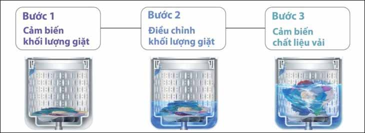 Máy giặt tự động thực hiện quá trình 3 bước: Cảm biến lượng nước, điều chỉnh khối lượng giặt và cảm biến chất liệu vải, từ đó xác định thời gian giặt cần thiết và đưa ra chương trình giặt phù hợp nhất.