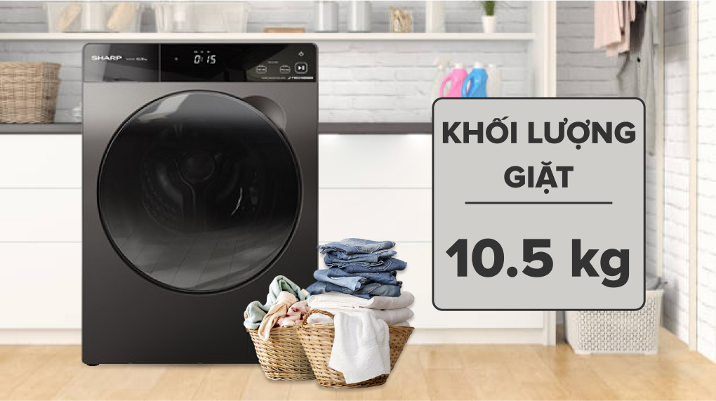 Sharp ES-FK1054PV-S cho khả năng giặt quần áo với khối lượng lên đến 10.5 kg, đáp ứng nhu cầu xử lý quần áo sạch sẽ trong một lần giặt cho các gia đình đông thành viên từ 7 người trở lên, nếu có ít thành viên hơn nhưng nhu cầu giặt giũ cao thì sản phẩm vẫn đáp ứng được nhu cầu giặt giũ.