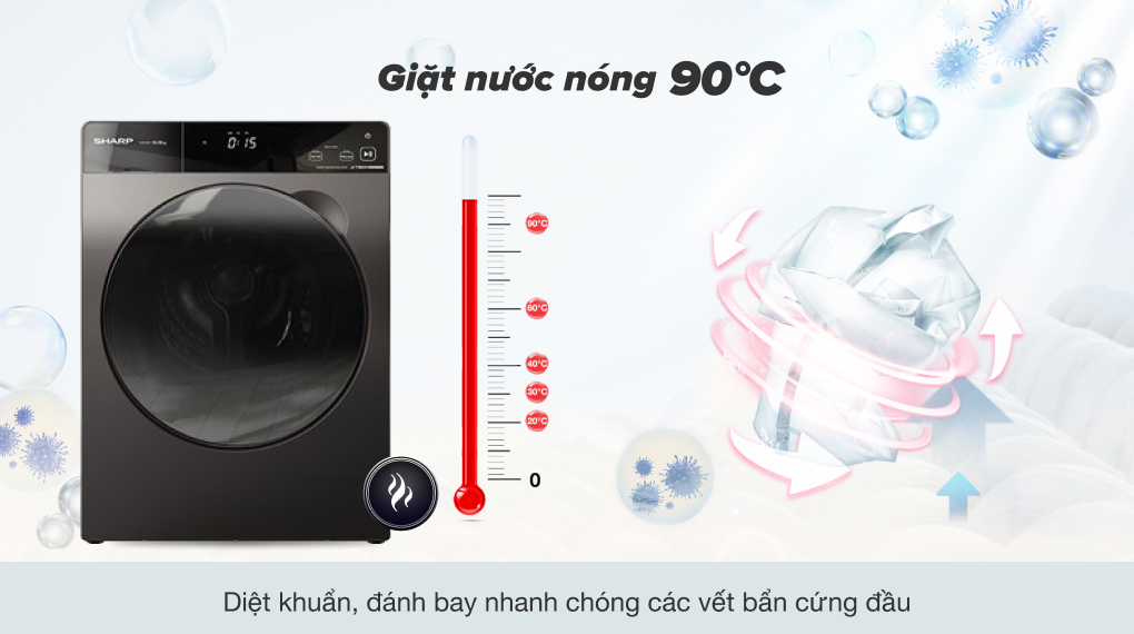 Chế độ giặt nước nóng đến 90 độ C giúp đánh bay mọi vết bẩn cứng đầu