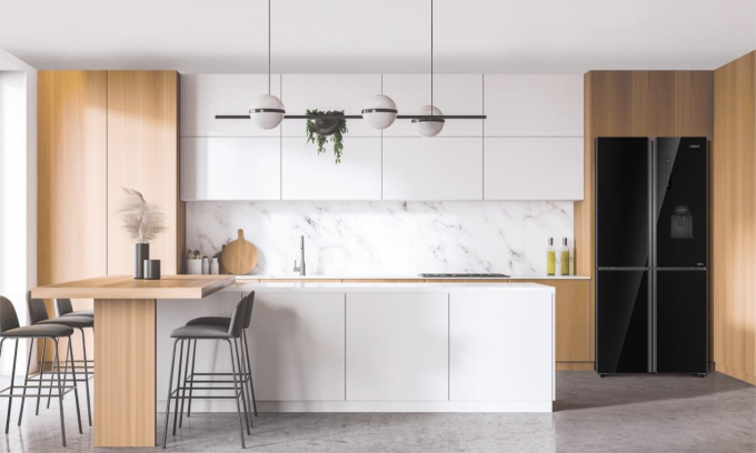 Sản phẩm tủ lạnh 4 cửa mặt gương có thiết kế phù hợp cho không gian hiện đại. Ảnh: Aqua