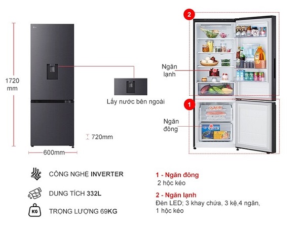 Thông số kỹ thuật Tủ lạnh LG Inverter 332 lít LBD33BLMA