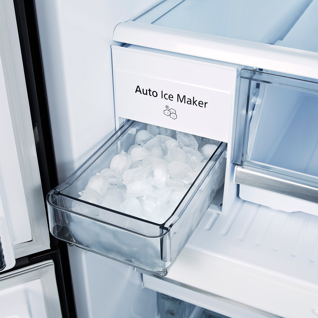 Ngoài ra, tủ lạnh còn được trang bị tính năng làm đá tự động, chỉ cần đổ nước vào phần bình chứa, tủ sẽ tự làm đá và tạo ra các viên đá nhỏ phục vụ cho người dùng mà không mất công đổ vô khay rồi xả nước vô khay lấy đá.