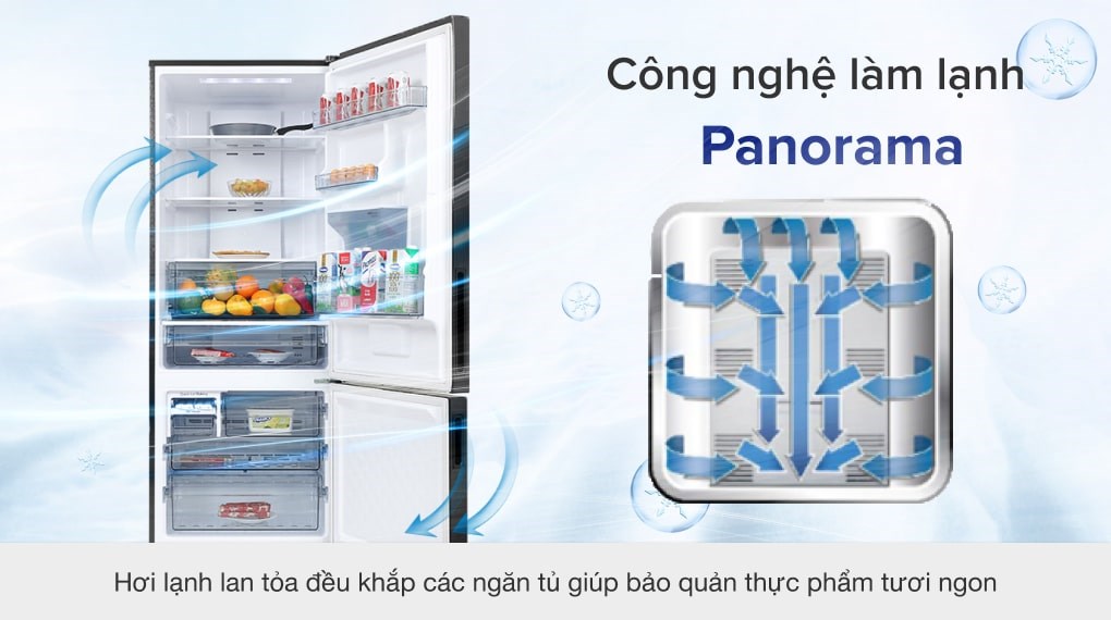Công nghệ làm lạnh đa chiều Panorama đưa luồng khí lạnh di chuyển nhanh chóng đến mọi ngóc ngách tủ lạnh, nhờ đó thực phẩm được làm lạnh toàn diện, tránh tình trạng hư hỏng thực phẩm.