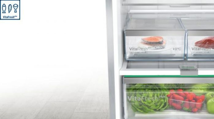 Tủ lạnh Bosch KAD93VBFP với ngăn chứa VitaFresh đảm bảo dự trữ thực phẩm lâu ở ở xung quanh 0ºC. Hai ngăn riêng biệt chứa thịt riêng và cá riêng để đảm bảo không lẫn mùi giữa hai thực phẩm. Ngăn chứa rau củ lớn với nút trượt điều chỉnh độ ẩm giúp lưu trữ rau quả lâu hơn. Giữ lại vitamin tốt cho thực phẩm.