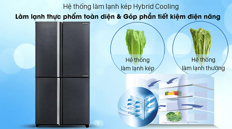 Hệ thống làm lạnh kép với quạt làm lạnh phía trên cùng của khoang mát kết hợp với tấm kim loại phía sau tủ, thực hiện việc phân tán đều hơi lạnh cho mọi khu vực trong khoang tủ, duy trì tối ưu độ ẩm và nhiệt độ lạnh trong tủ. Thiết kế làm lạnh gián tiếp từ phía sau tủ giúp ngăn ngừa tình trạng mất nước, khô cứng thường gặp ở thực phẩm cũng như hạn chế tình trạng nhiệt độ quá lạnh và không đồng đều giữa các khu vực bên trong tủ lạnh Sharp.